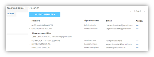 Desde el menú Configuración >> Usuarios, se pueden dar de alta, indicando un Nombre y un email.